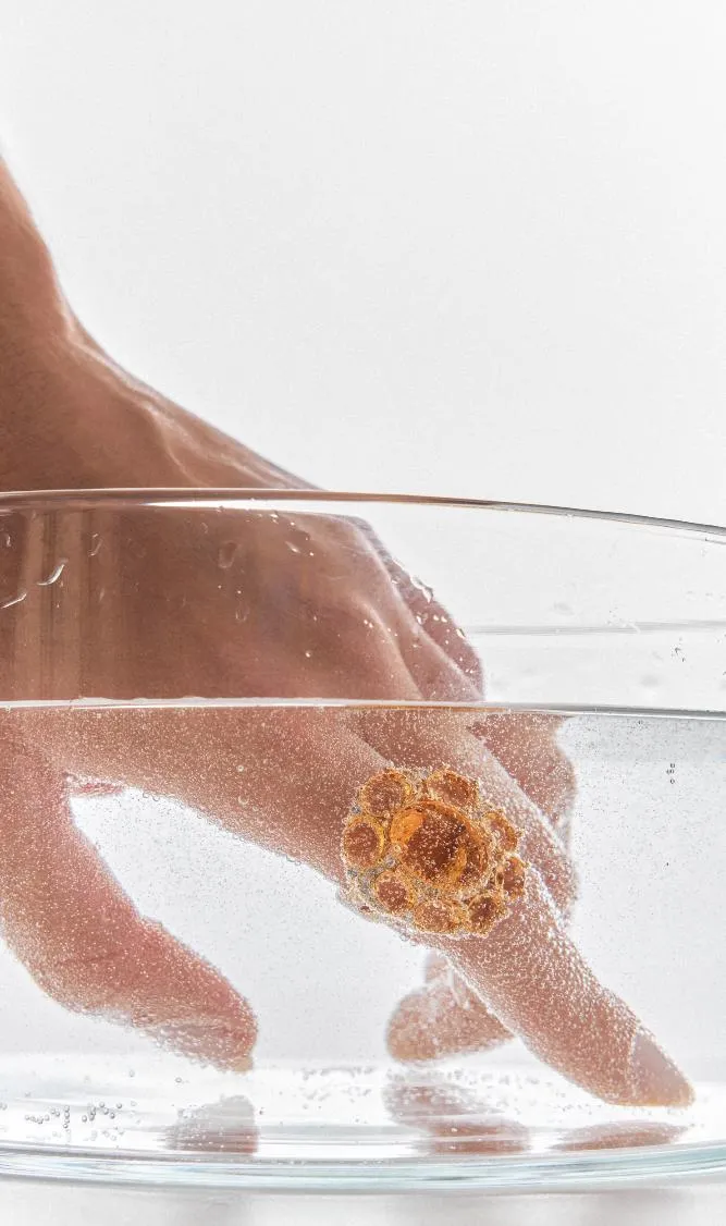 O design, representado pelo âmbar, é um símbolo de cuidado e energia. Esse elemento se une à leveza visual inspirada na água, criando uma estética fluida, sensível e etérea.