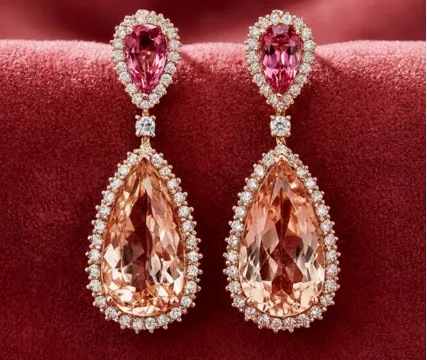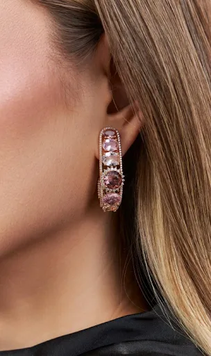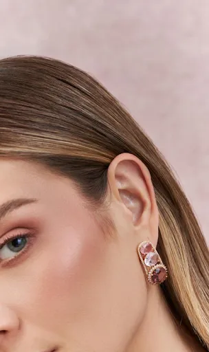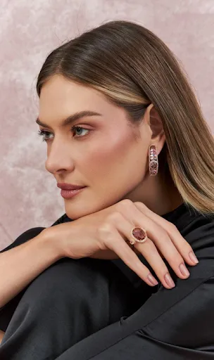 Com cristais em tons de morganita e rodalita, cada peça carrega uma delicadeza marcante, revelando um equilíbrio perfeito entre o clássico cult e a sensibilidade contemporânea.