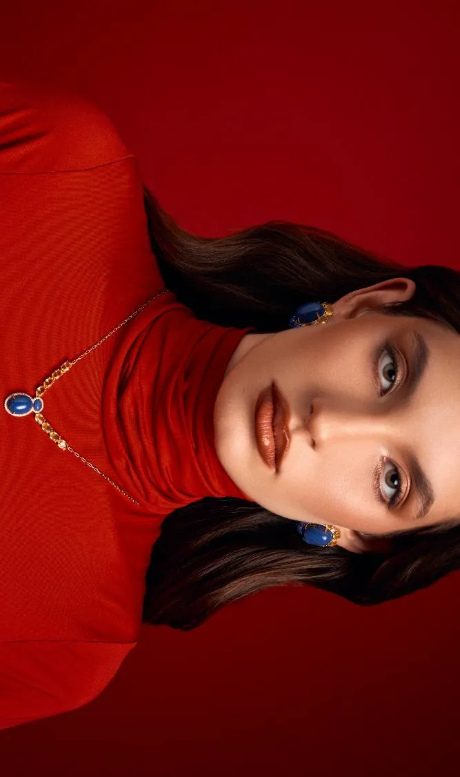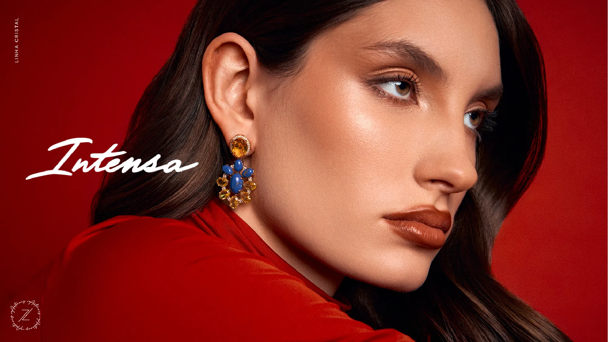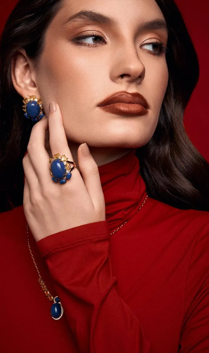 Intensa nasce da força de uma mulher que vive de verdade, que transforma emoção em presença e intensidade em estilo. Inspirada no azul profundo da sodalita. A coleção traduz sentimentos em formas marcantes, onde o brilho e a cor se encontram para criar uma estética envolvente e sofisticada.