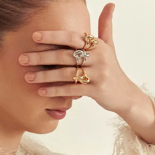 Anéis duplos – Esse modelo, bastante moderno e versátil, pode ser utilizado em um mix de joias ou sozinhos. Suas variações podem ser mais chamativas ou mais singelas, tudo dependerá do estilo de quem está usando e do tamanho das peças.