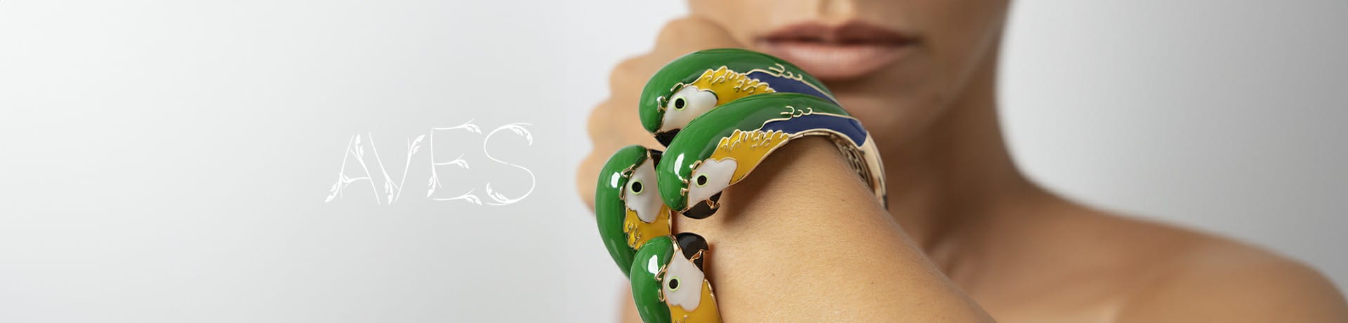As aves simbolizam proteção, inteligência e também a liberdade. O conceito da coleção sugere um tom surrealista e uma necessidade contínua de escapismo através do design emotivo, com alegres e expressivas silhuetas de animais. Neste lançamento trazemos tucanos e araras em cores vibrantes, representados em braceletes banhados a ouro com esmaltação.