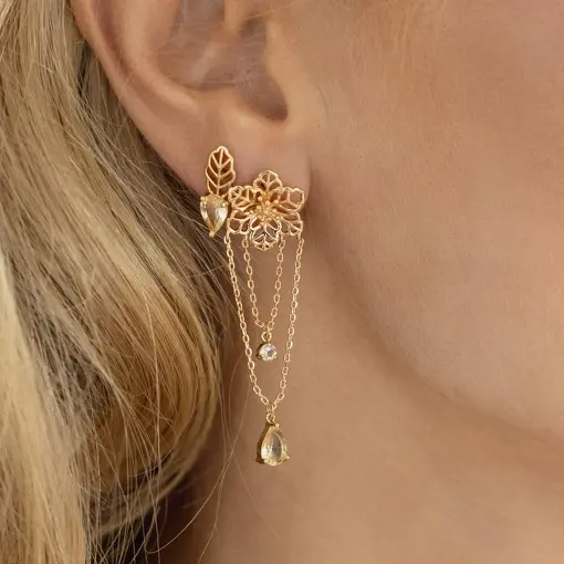 0230355 - BRINCO PÊNDULO DE FLOR E CRISTAIS PRASIOLITA BANHADO A OURO