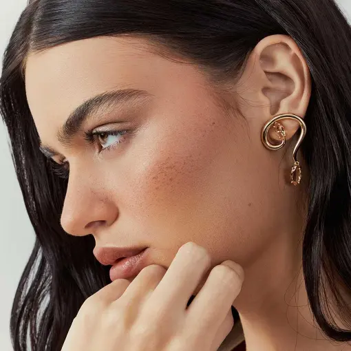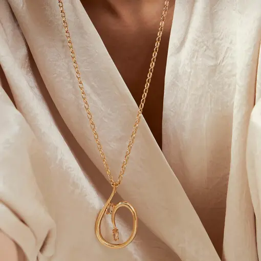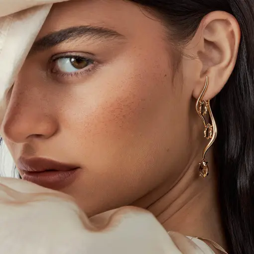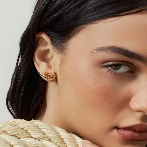 Essa coleção guarda essa ideia no cristal âmbar: como se o tempo tivesse aprendido a preservar o que é precioso. E traduz isso em peças douradas de forma orgânica, curvas que parecem acontecer naturalmente, sem pressa, sem excesso.