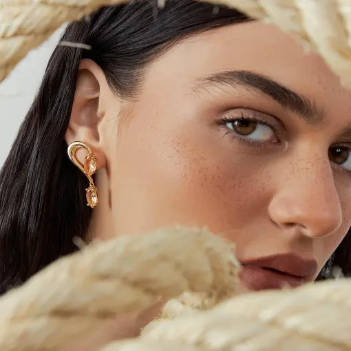 0241346 - BRINCO PÊNDULO CURVO E VAZADO COM CRISTAL NAVETE