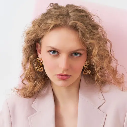 0238494 - BRINCO PÊNDULO DE CORAÇÕES VAZADOS E ZIRCÔNIAS BANHADO A OURO