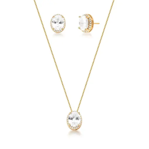 0902857 - CONJUNTO COLAR E BRINCO COM CRISTAL OVAL BANHADO A OURO