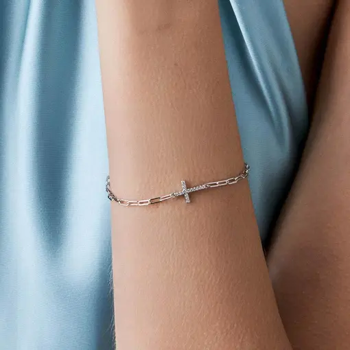0511221 - PULSEIRA COM CRUZ EM ZIRCÔNIAS E ELOS OVAIS PRATA RODINADA