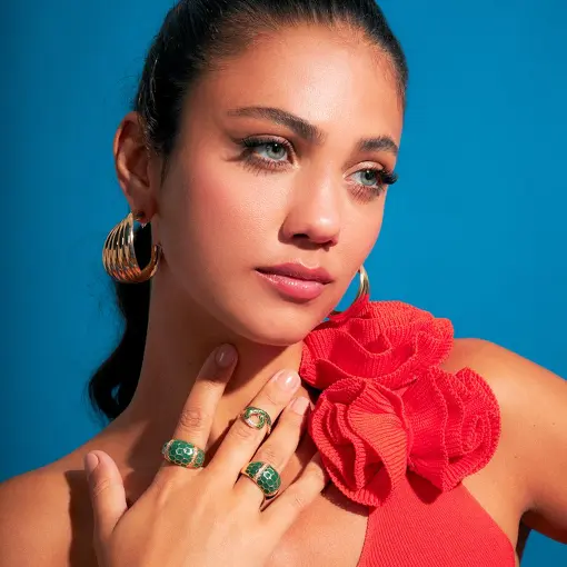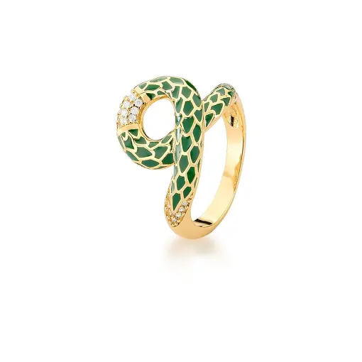 0116302 - ANEL COM ZIRCÔNIAS BRANCAS E ESMALTADO VERDE BANHADO A OURO