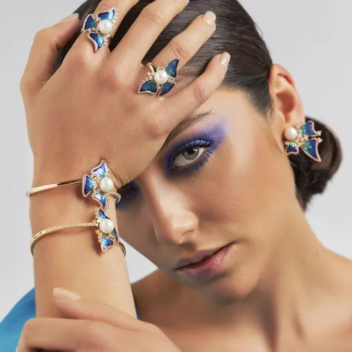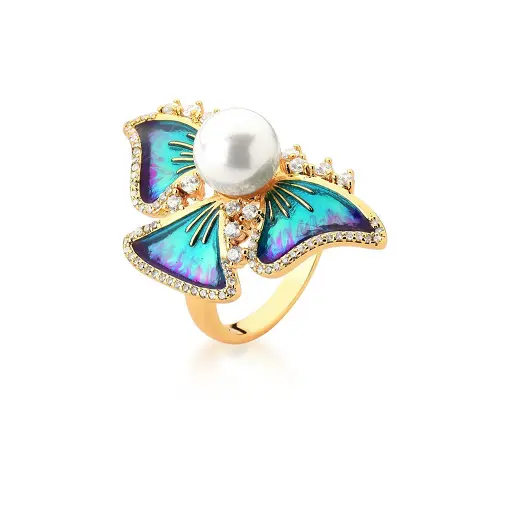 0114617 - ANEL DE BORBOLETA AZUL IRIDESCENTE E PÉROLA BANHADO A OURO