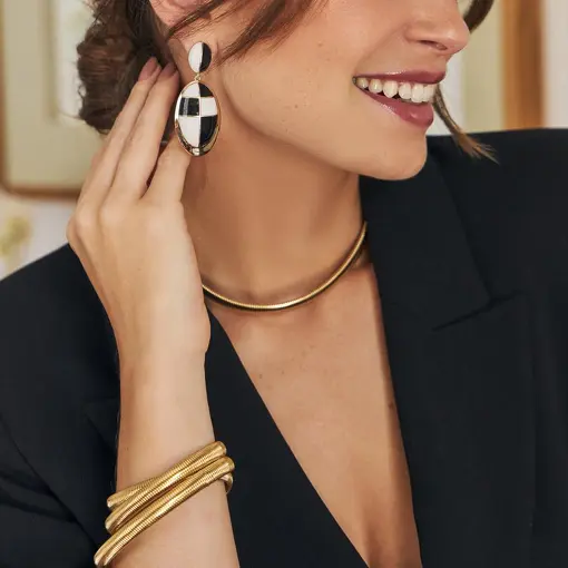 0234510 - BRINCO PÊNDULO OVAL ESMALTADO XADREZ BANHADO A OURO